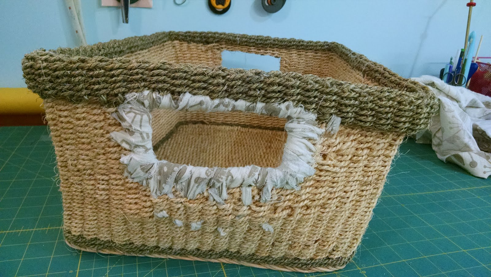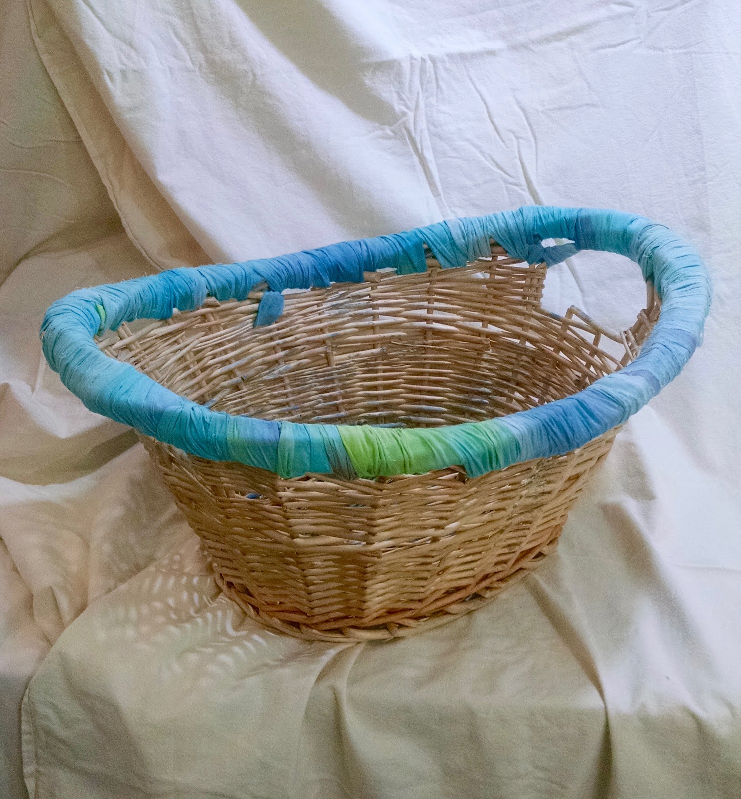 In the every day course of my life, I aim to buy high quality items for daily use, but occasionally those items have accidents or just wear down and break. When any of my beloved baskets starts to fall apart, I try to mend it and extend its lifespan. I turn to fabric for this task (since I happen to own a fabric store and literally have tons of it) but if I can use something laying around the house, that's even better.