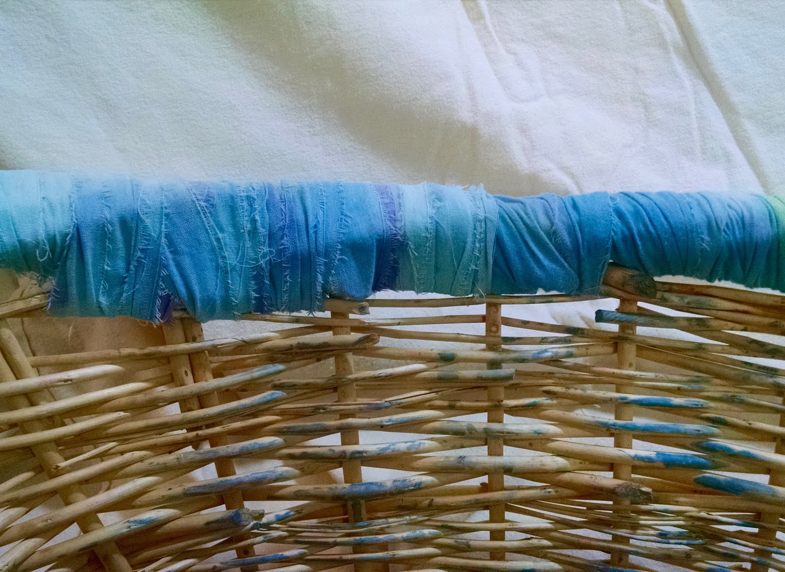 Starting with a basket that has given way to natural wear and tear, I decide what I want my color palette to be for the mending project. In this case, I went with neutrals. I tear (or snip) the fabric into strips - the width depends on the type of basket I'm working with and is pretty intuitive. For this one I used an old curtain cut in to 1/2" strips, but whatever is handy will do.