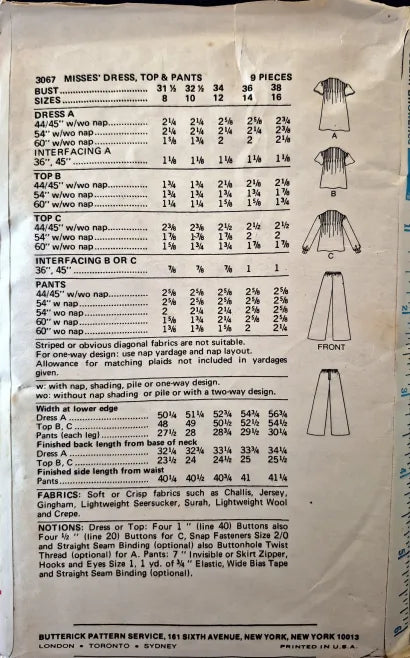 Vintage Butterick 3067 | Misses' Dress, Top, & Pants | Size 14