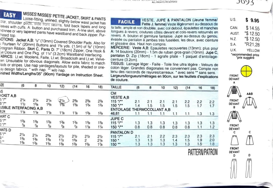Butterick 3693 | Misses'/Misses' Petite Jacket, Skirt, & Pants | Size 6-12