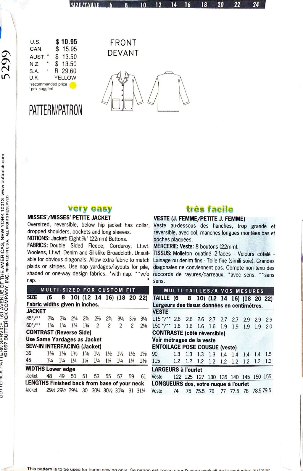 Butterick Fast & Easy 5299 | Misses' Petite Jacket | Size 12-16