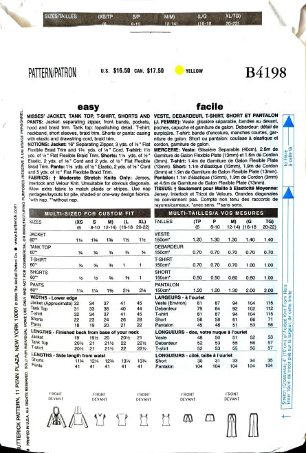 Butterick B4198 | Misses' Jacket, Tank Top, T-Shirt, Shorts, & Pants | Size XS-M
