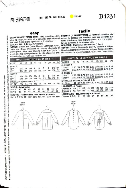 Butterick B4231 | Misses'/Misses' Petite Shirt | Size 14-18