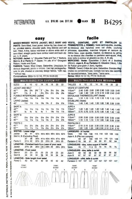 Butterick B4295 | Misses'/Misses' Petite Jacket, Belt, Skirt, & Pants | Size 8-14