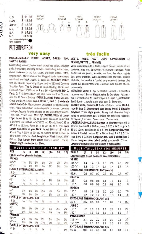 Butterick Fast & Easy 5049 | Misses' Petite Jacket, Dress, Top, Skirt, & Pants | Size 6-12