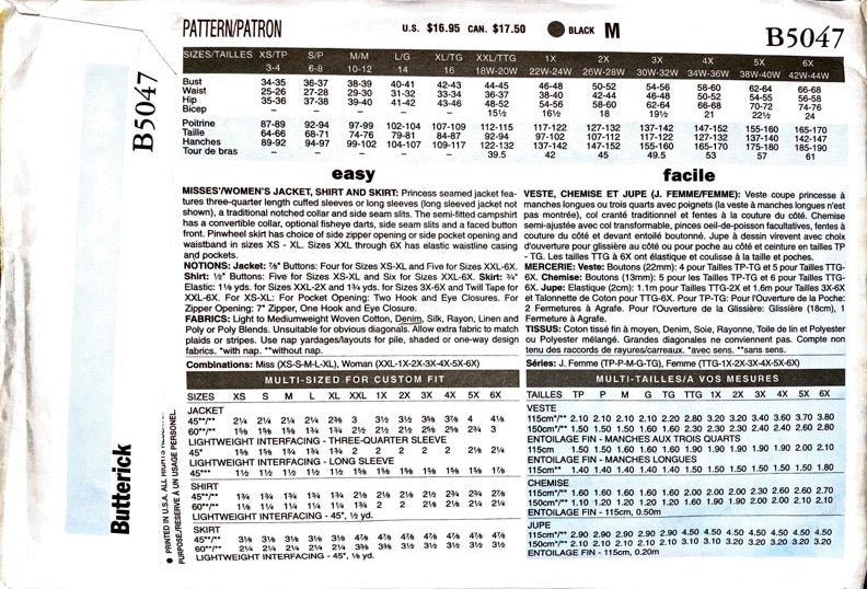 Butterick B5047 Connie Crawford | Misses'/Women's Jacket, Shirt, & Skirt | Size XS-XLG