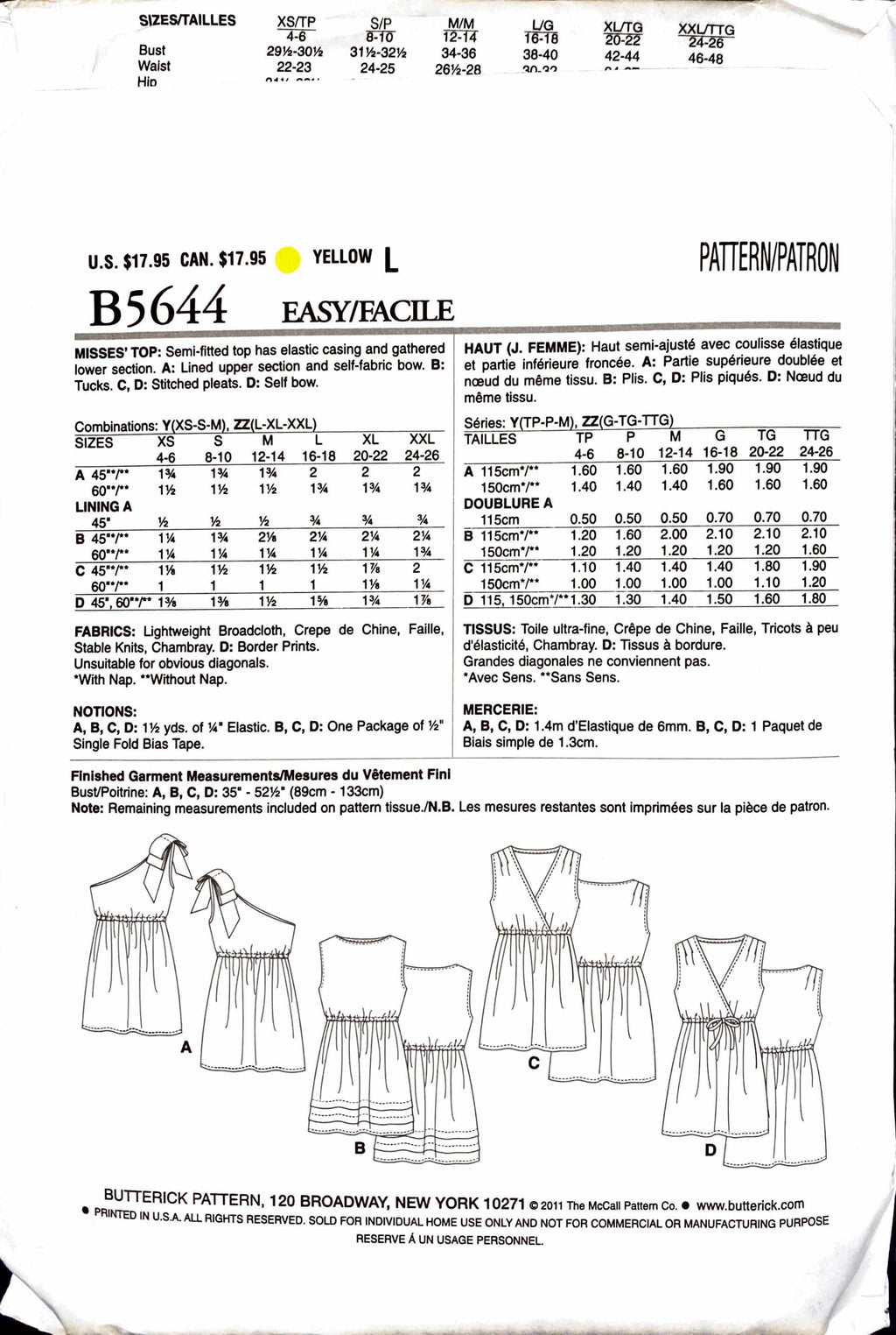 Butterick B5644 | Misses' Top | Size Lg - XXL