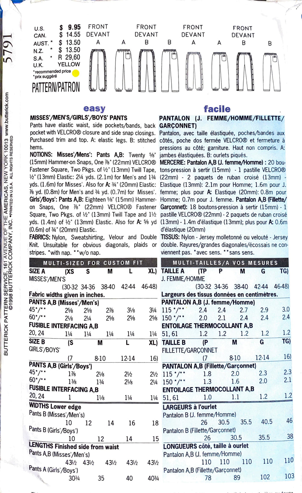 Butterick 5791 ©️1998 | Misses'/Men's/Girl's/Boy's Pants | Size A/XS-XL