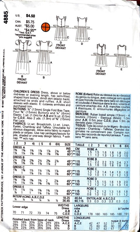 Butterick Classics 4885 | Children's Dress | Size 5-6-6x