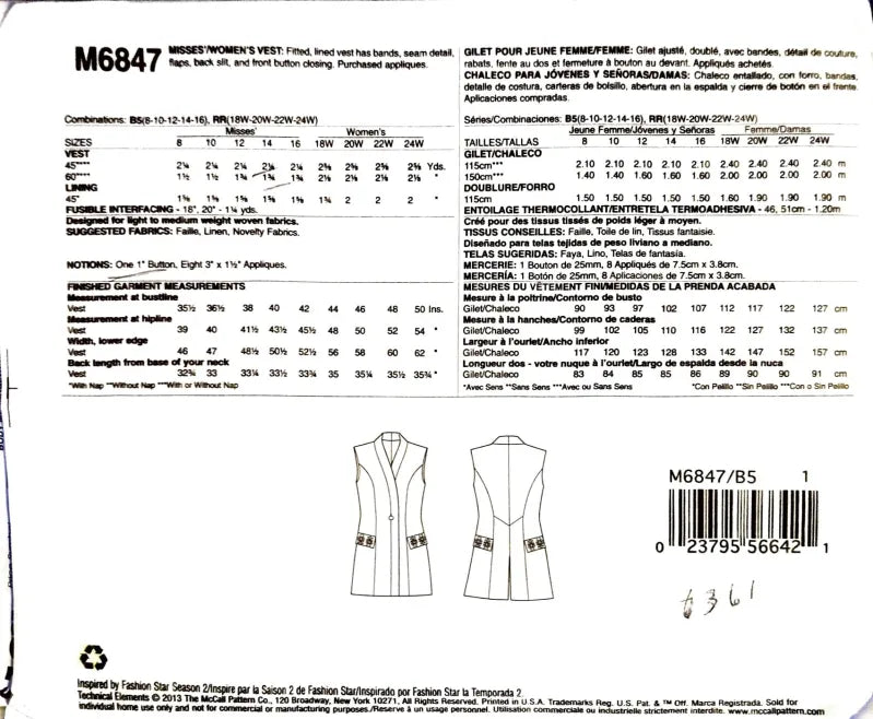 Fashion Star McCall's M6847 | Misses'/Women's Vest | Size 8-16