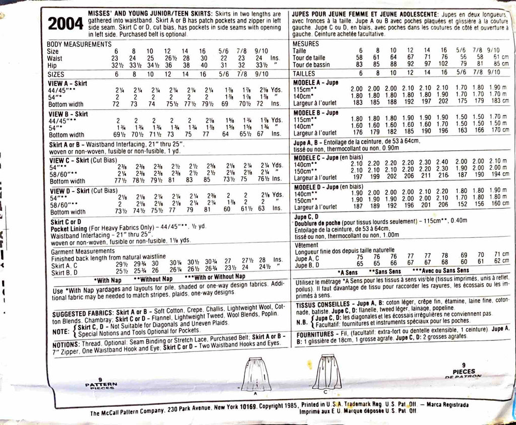 McCall's 2004 | Misses' and Young Junior/Teen Skirts | Size 9-10
