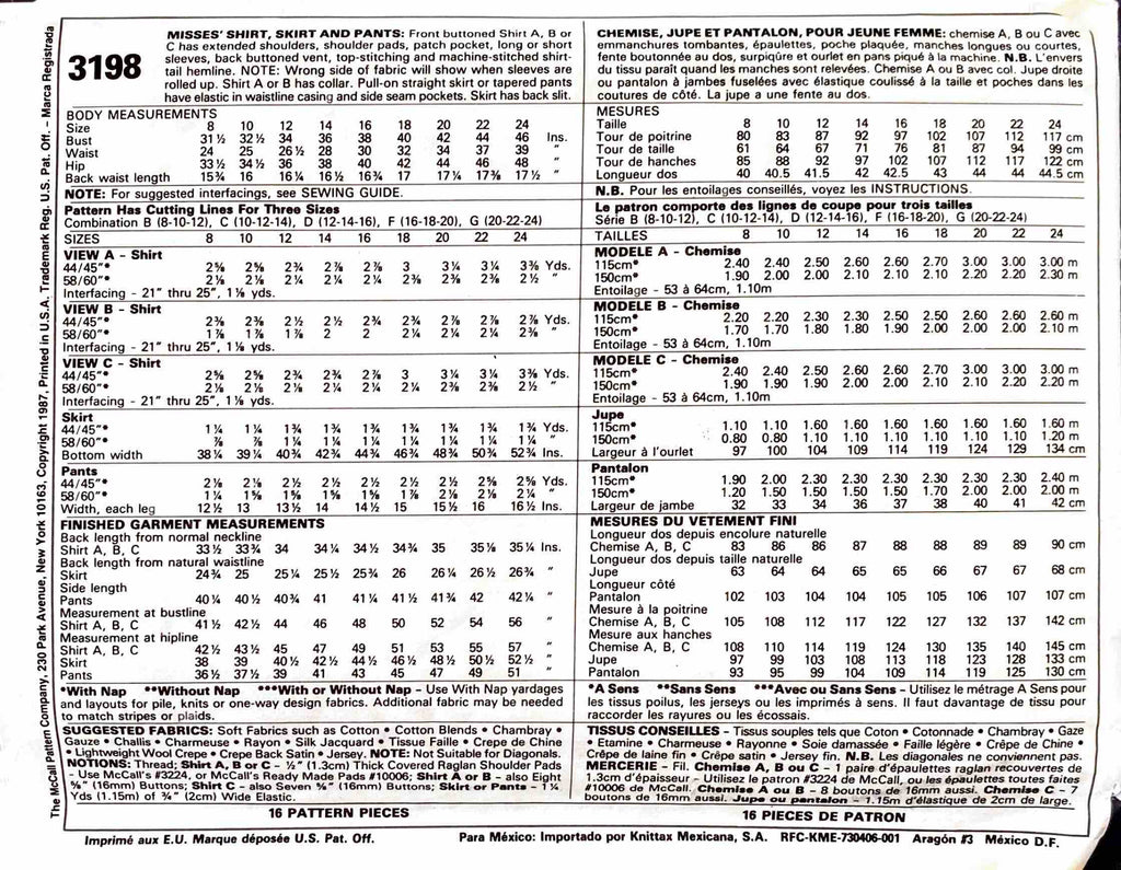 McCall's 3198 | Misses' Shirt, Skirt, and Pants | Size 16-20