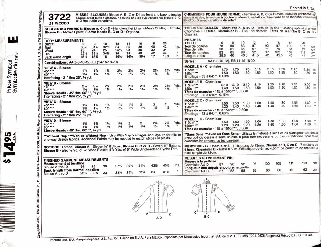 McCall's 3722 | Misses' Blouses | Size 14-20
