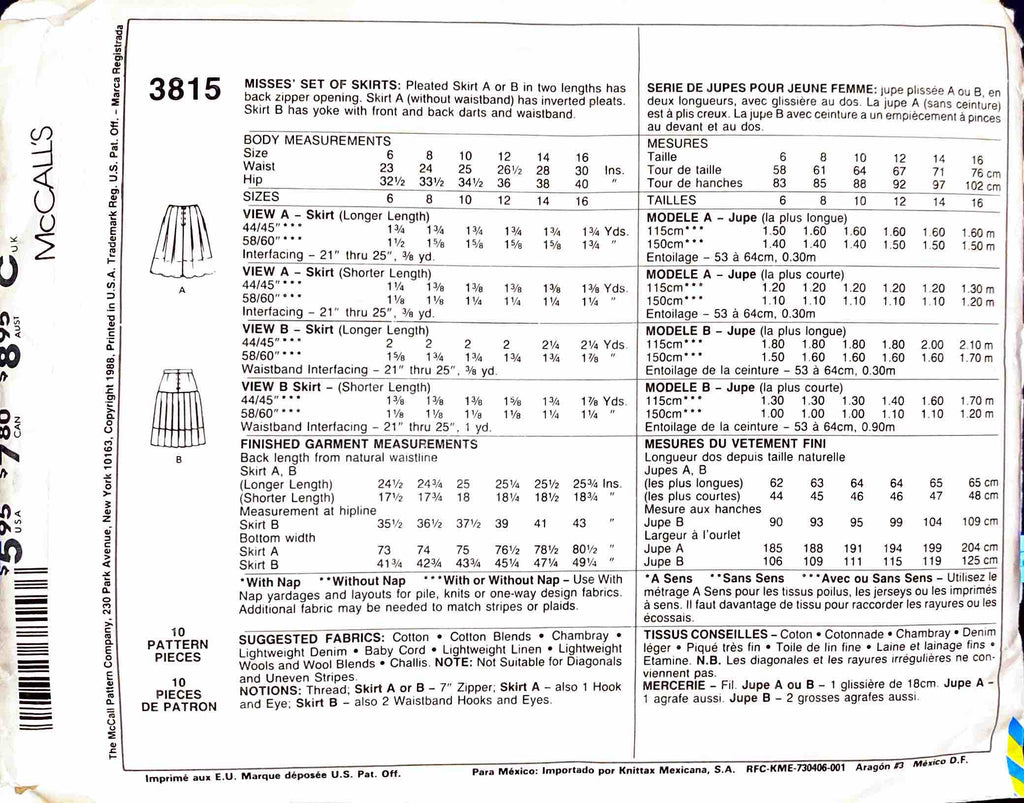 McCall's 3815 | Misses' Set of Skirts | Size 10