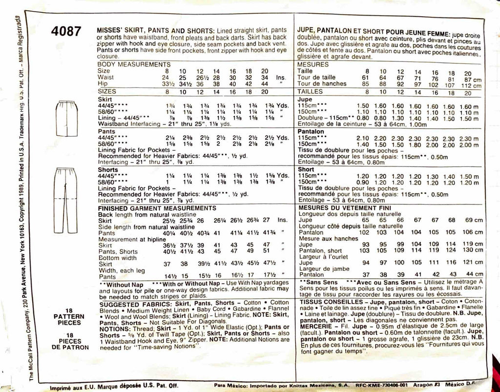 McCall's 4087 Busy Woman's Sewing Pattern | Misses' Skirt, Pants and Shorts | Size 20