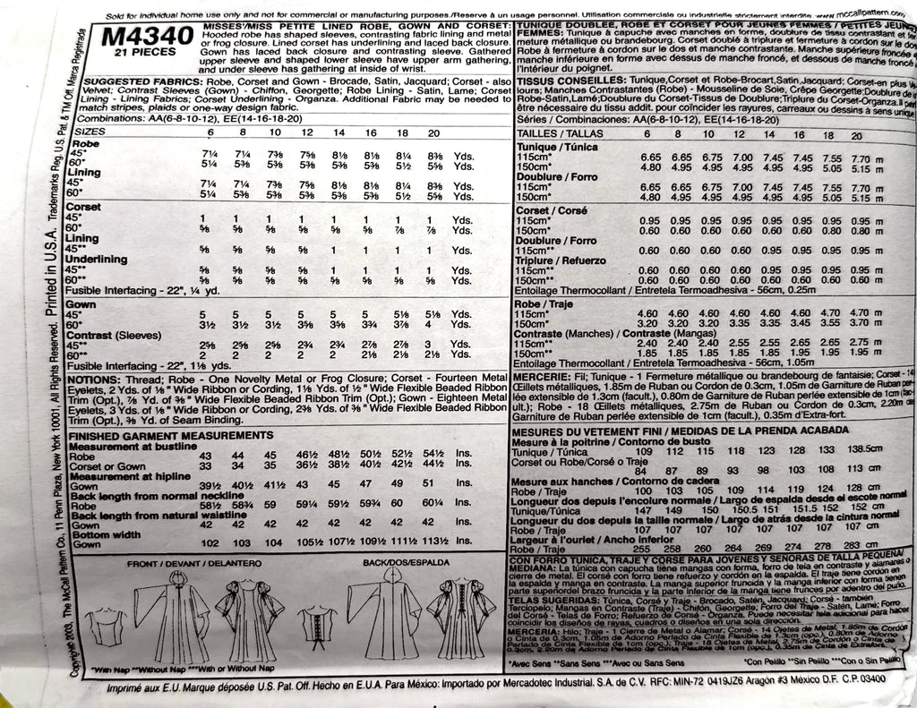 Hooded robe has shaped sleeves, contrasting fabric lining and metal or frog closure. Lined corset has underlining and laced back closure. Gown has laced back closure and contrasting sleeve. Gathered upper sleeve and shaped lower sleeve have upper arm gathering, and under sleeve has gathering at inside of wrist.