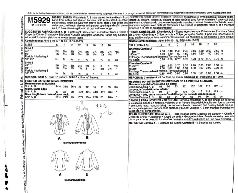 McCall's M5929 | Misses' Shirts | Size 6-14
