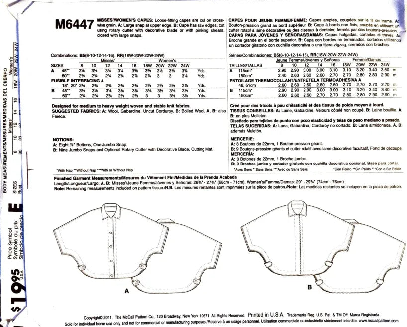 McCall's M6447 | Misses'/Women's Capes | Size 8-16