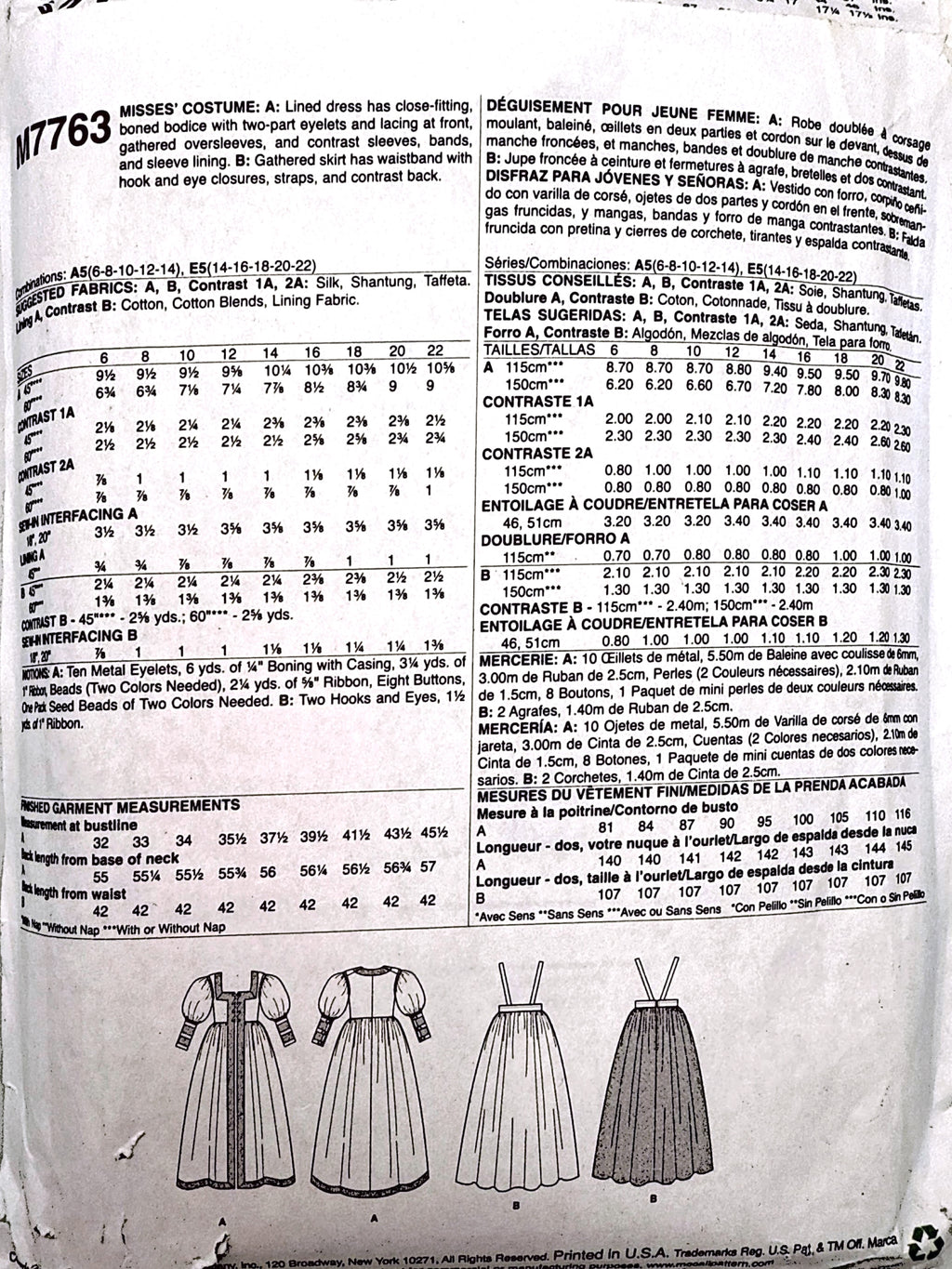 A: Lined dress has close-fitting, boned bodice with two-part eyelets and lacing at front, gathered oversleeves, and contrast sleeves, bands, and sleeve lining. B: Gathered skirt has waistband with hook and eye closures, straps, and contrast back.