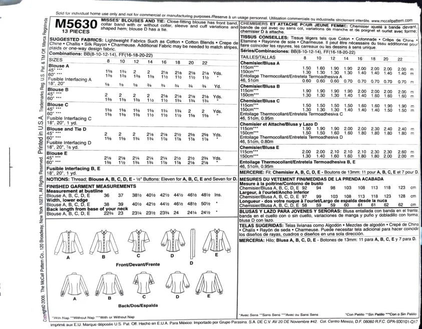 McCall's Palmer Pletsch M5630 | Misses' Blouses and Tie | Size 8-14