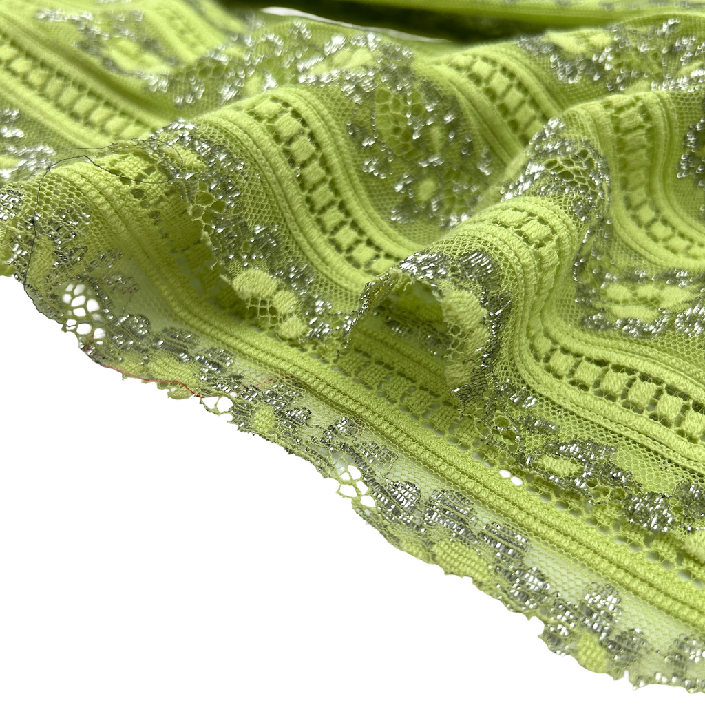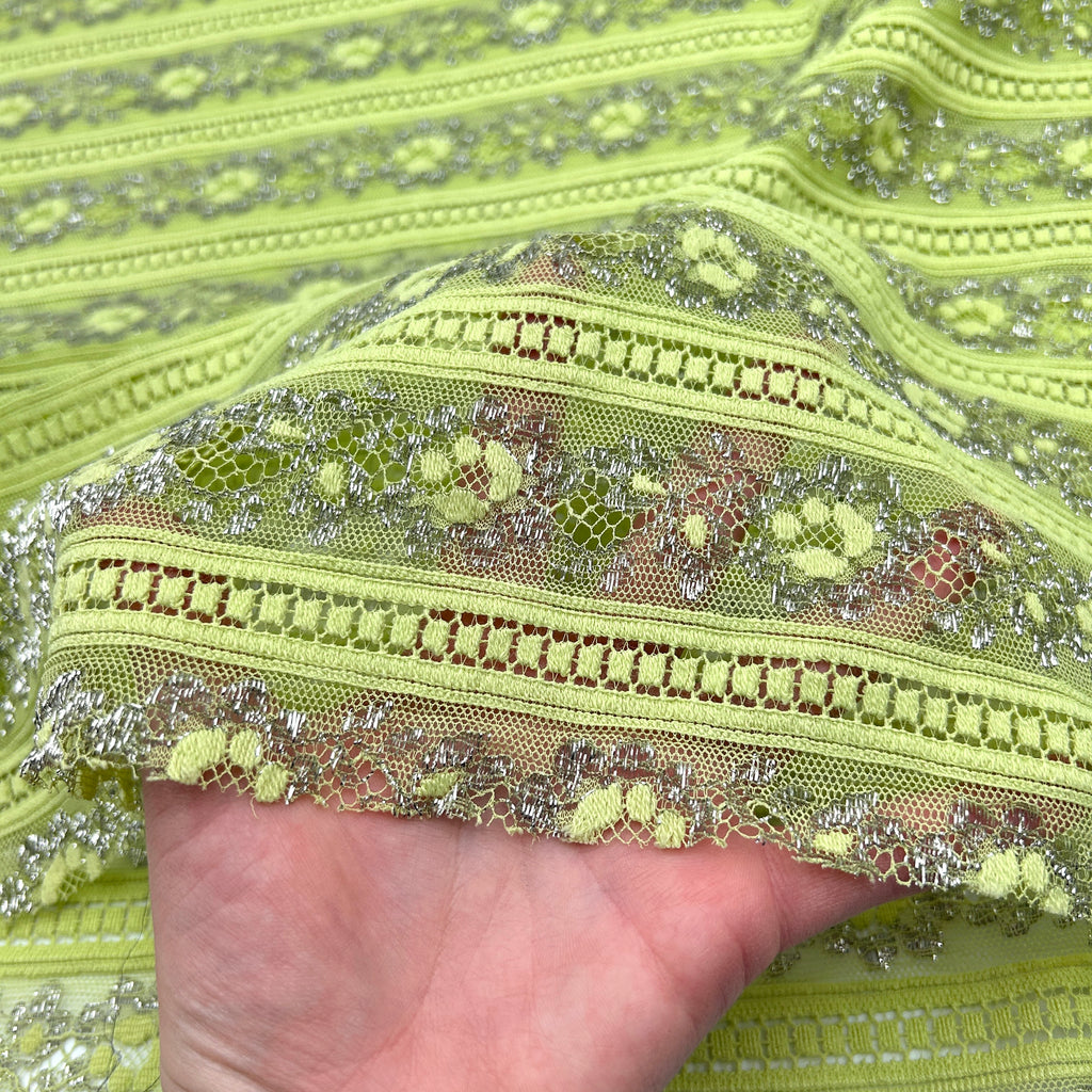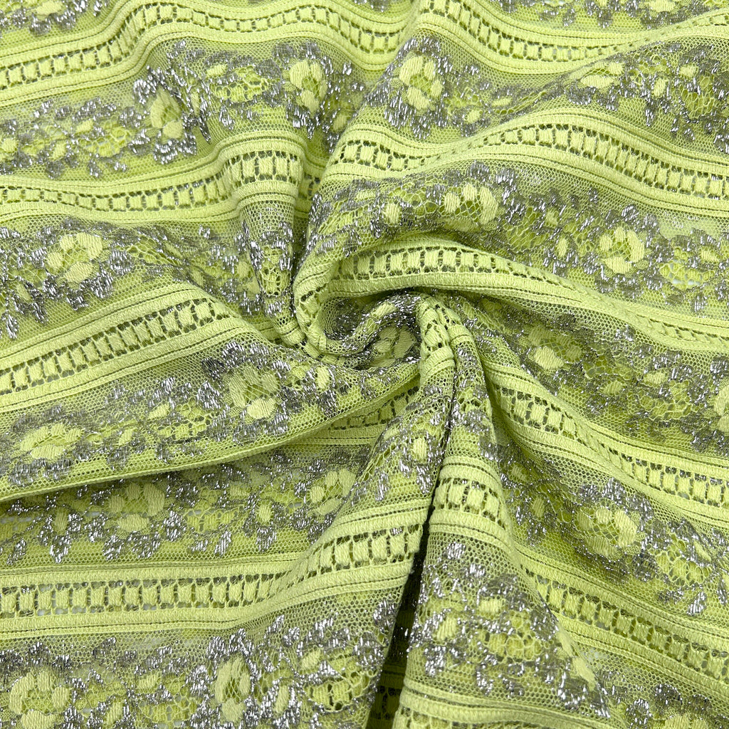This bright lace is a metallic lace. It would be excellent for use as an overlay or a fancy blouse!