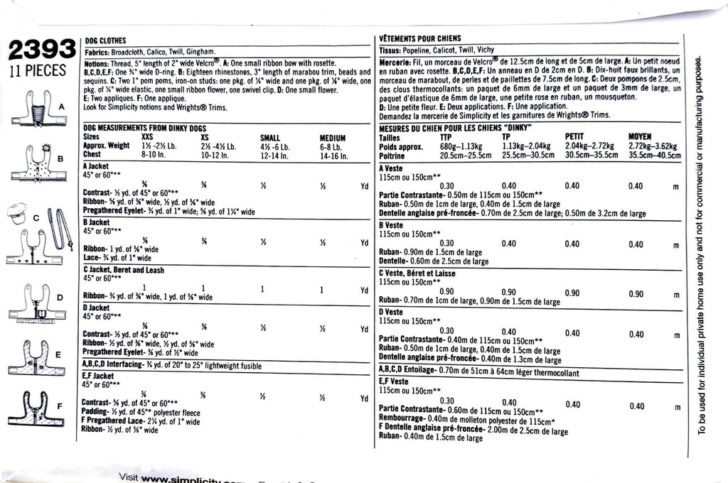 Simplicity 2393 | Dog Costume | Sizes XXS - M
