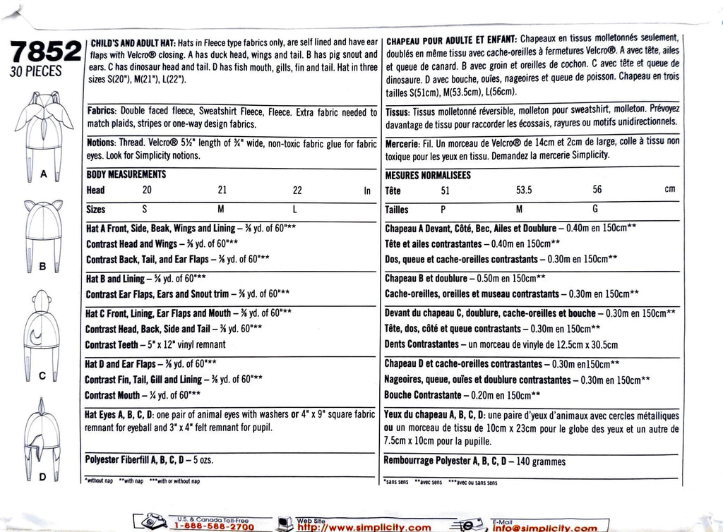 Simplicity 7852 | Kids and Adults Hats | Sizes S-L