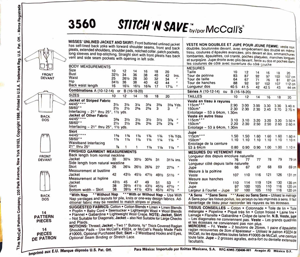 Stitch 'N Save McCall's 3560 | Misses' Unlined Jacket and Skirt | Size 10-14